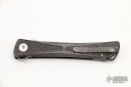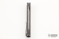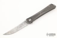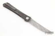 This Custom Bones flipper from Jeff Park features a Damascus blade with notched thumbrest and flipper. The handle has a milled zirconium frame and backspacer, and a titanium tip up clip. Blade is centered when closed, flips well, and locks up with no play. Excellent condition.