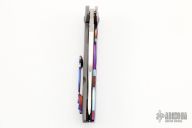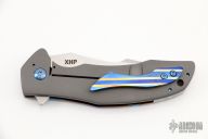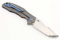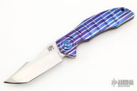 This T22 by Ed Cope has a hand rub satin finished tanto blade with flipper. The handle has a MokuTi and bead blasted titanium frame with a MokuTi tip up clip and backspace, anodized titanium hardware. Comes with a zippered case. Nice detent, lockup and blade seating. Rides on bearings. Excellent condition.
