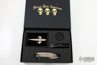 This set from TKI 2015 is incredible. Comes with a bronze stonewashed ANAX with an integral black aluminum frame with lanyard hole. Nice detent, lockup and blade seating. Dagger logo on the blade along with s/n. B-side of blade has TKI logo. All hardware has been bronzed. Also comes with box, COA, bronzed titanium dagger logo patch, a black aluminum and flamed titanium Siphon pen, black Challenge Coin and black stonewashed titanium credit card knife with carbide edge. All items in set share a matching serial number. New condition. #044