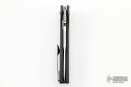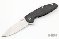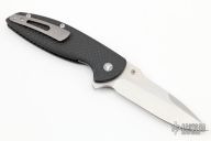 This Turbo is a Peter Carey design by Monterey Bay Knives. It features a satin finished San Mai drop point blade with swedge, notched thumbrest and flipper. The handle has carbon fiber scales, and inset lock, black tip up clip, and dragon spine backspacer.  Rides on bearings. Nice detent, lockup and blade seating. Excellent condition.