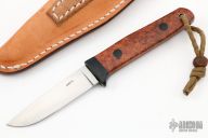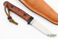 This Belt Knife by Hiroaki Ohta features a hand rubbed satin finished blade, .124" blade stock and .785" blade depth, hidden tang construction. The handle has a black linen micarta guard and frame, amboyna burl wood scales with black pins and a lanyard hole. Comes with a brown leather sheath with kydex inside, has a belt loop. Excellent condition.