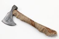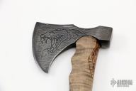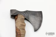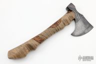This Miniature Hatchet by Dirk Loots features an acid etched blade with hammer pole. The handle is curly maple that is carved with a snakes body, which ends on the head of the hatchet with the head of the snake. Excellent condition.