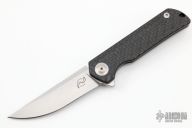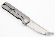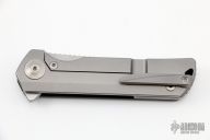 This Warrior 1 by Reate Knives is a Liong Mah design, it features a tumbled drop point blade with a notched thumbrest.  The handle has a carbon fiber and blasted titanium frame, blasted titanium backspacer with tritium and tip up blasted titanium clip. Rides on bearings. Nice detent, lockup and blade seating.  Has some scuffs, otherwise excellent condition.