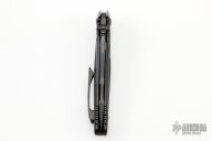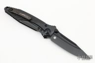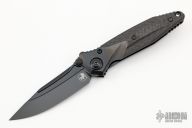 This Socom Bravo by Microtech is made in China by Rike Knife, it features a black blade, notched thumbrest, and dual thumbstuds. The handle has black titanium bolsters/liners, black pivot collars, carbon fiber scales. Tip up carry black titanium clip. Black titanium backspacer. Comes with original box and papers. Excellent condition.
