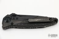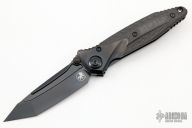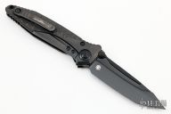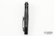 This Socom Bravo by Microtech is made in China by Rike Knife, it features a black blade, notched thumbrest, and dual thumbstuds. The handle has black titanium bolsters/liners, black pivot collars, carbon fiber scales. Tip up carry black titanium clip. Black titanium backspacer. Comes with original box and papers. Excellent condition.