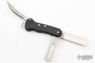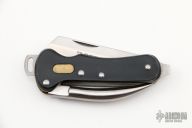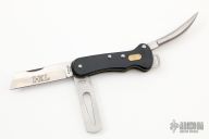 This knife features a wharncliffe blade with a single nail nick.  The is knife features a blade, shackle key and marlin spike.  The handle features black scales over brass liners.  The tip of the blade is bent otherwise the knife is in good condition.