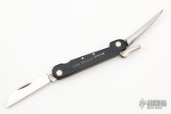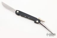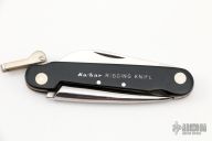 This knife features a wharncliffe blade with a single nail nick.  The is knife features a blade and marlin spike.  The handle features a black scales over brass liners.  Scuffs/scratches are visible otherwise the knife is in excellent condition.