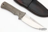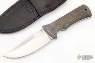 This fixed blade, by Johnathan Mcnees, features a satin finish clip point style blade with a full tang construction. .169" Blade Stock 1.31" Blade Depth. The handle is composed of contoured green G10 scales with micarta pins. The pommel features a lanyard hole. Includes COA, and leather horizontal carry sheath. Excellent condition.