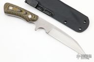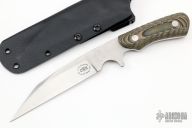 This Long Defender by Chuck Schuette features a hand rub satin finished blade with false top edge and textured flats, notched thumbrest, .136" blade stock and 1.104" blade stock, full tang construction. The handle has black/green/tang scales with black liners. Comes with a kydex sheath with Ulti-Clip. New from maker.