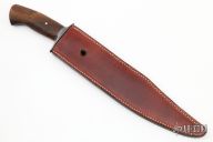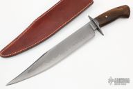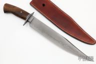 This Bowie from Charlie Edmondson features a hand rub satin finished blade with swedge and nice hamon, .290" blade stock and 1.762" blade depth, hidden tang construction. The handle has a Damascus guard and wood grip with a steel pin. Comes with a brown leather sheath. Has a couple light scuffs, otherwise excellent condition. This thing is a pretty cool.