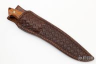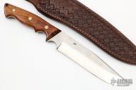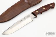 This knife by Master Smith Murray Carter wears his Journeyman Smith stamp! It features a stainless clad San Mai blade with .196" blade thickness and 1.463" blade depth, full tapered tang construction. The handle has cocobolo scales with brass/stainless pins. Comes with a hand tooled brown leather sheath. Excellent condition.