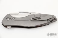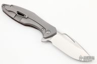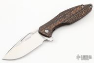 This Arius by Koenig knives features a brightwashed w/ PF finished blade with thumbhole and notched flipper. The handle has a bead blasted titanium frame, smooth woven copper carbon fiber front scale, titanium backspacer and tip up clip with hidden screws. Has ceramic bearings and a ceramic detent ball. Nice detent, lockup and blade seating. Comes with original box and COA dated October 17, 2022. New from maker at the 2022 CCKS.