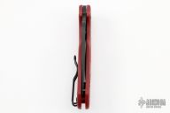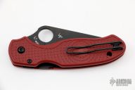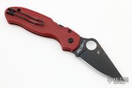This Para 3 by Spyderco Knives features a black blade with a thumbhole and notched thumbrest. The handle features red FRN scales and a steel tip up pocket clip. Includes the original box and papers. New Condition.