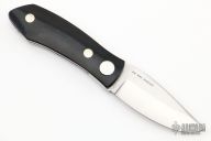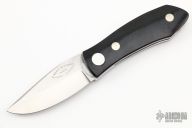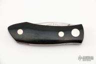 This Barry Wood swing lock folder features a satin finish blade and satin finish stainless steel frame with black linen micarta scales. This is a very unique scissor opening folder, which when the blade is fully open and locked in place is almost a fixed blade knife. The handle is nicely contoured for a comfortable grip. Opening is accomplished by lighting pressing down and outward at the rear indentation on the spine, which releases the locking pin and allows one side of the handle and the blade to rotate down then forward until the blade locks in the forward position. The one side of the handle continues to rotate back until it locks in place. Closing requires the same slight thumb pressure at the indentation to release the locking pin, then the one side of the handle is rotated back and around, catching the blade and aligning both with the other side of the handle in a locked closed position. Comes with zipper case, and original papers. Has light scuffs and scratches throughout, great condition otherwise.