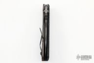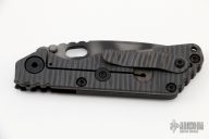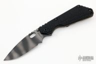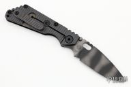 This SNG framelock folder by Mick Strider features a tiger stripe blade and a dimple pattern black G-10 and flamed titanium frame and tip up titanium clip. Includes a "Lock Bar Stabilizer" for maximum reverse lock retention. Nice detent, lockup and blade seating. New Condition.