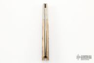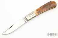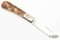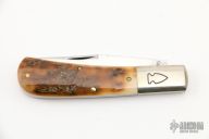 This Madison Barlow from Northwoods Knives features a clip point blade with swedge, nail nick, and polished finish. The handle is comprised of nickel silver arrowhead bolsters with mammoth ivory covers and over brass liners and stainless steel spring. Has a few light scratches, otherwise excellent condition.