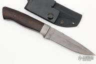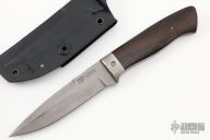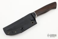 This knife by Bob Terzuola features a bead blasted blade with a sharpend top edge and a hidden tang construction.  The handle features bead blasted titanium bolsters and a wood grip.  Includes a kydex sheath.  Scuffs/scratches are visible on the blade and handle otherwise the knife is in good condition.