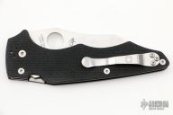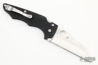 This Yojumbo by Spyderco features a satin finished wharncliffe blade with thumbhole. The handle has a black G-10 frame with stainless steel liners, lock is on the spine of handle. 4-way reversible stainless steel clip. Nice detent, lockup and blade seating. Excellent condition.