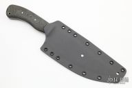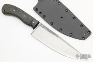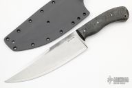 This Ranger Camp by Christopher (Big Chris) Berry features a satin finished blade with raw bar finished flats and false top edge, .151" blade stock and 2.096" blade depth, full tapered tang construction. The handle has black canvas micarta scales. Comes with a kydex sheath. Excellent condition.
