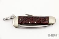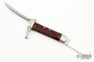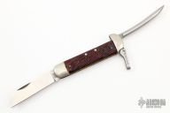 This Sailor's Knife from Schrade Knives features a satin finish sheepsfoot style blade with nail nick. There is also a marlin spike.  The handle has nickel silver bolsters and jigged synthetic covers over brass liners and stainless steel backspring. Nickel Silver lanyard bail. Scuffs, scratches and rust are visible.  This knife would make a good user.