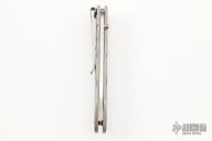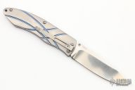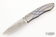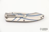 This button lock folder by Arno Bernard has a satin finished blade and a sleek brushed titanium handle with a blue anodized milled pattern. Both the thumbstud and the release button have a blue gemstone inset. Tip down carry clip. Very smooth action with nice lockup and blade seating. Has scratches, otherwise good user condition.