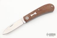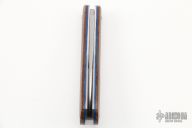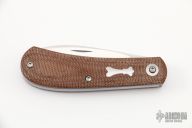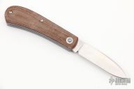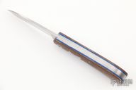 This Mini Zulu Spear from Pepe Jalomo features a satin finished blade with nail nick. The handle has natural canvas micarta covers with blue liners, stainless steel escutcheon, liners, and spring. Spring is flush in the closed and open positions. Comes with zipper case. #421. Excellent condition.