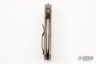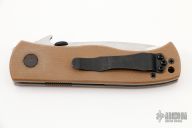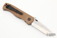 This production CQC-7V has a satin finish blade with a partially serrated edge and tan G-10 scales, titanium liners and a black SS tip up clip. #015. Comes with box and papers, and leather slip. Excellent condition.