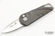 This Mini Auto by Brian Tighe features a mirror polish tumble finish blade with false top edge. The handle has a tumble finish and milled titanium frame with satin finish carabiner style clip. Fast opening, strong lockup. Excellent condition. Comes with a zippered case.