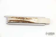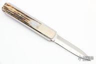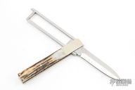 This Funny Folder by Crawford Knives has a mirror polished double edged blade. The handle has dovetailed and fileworked nickel silver bolsters and liners, stag scales, stainless steel faux tang. This unique folder has twin, perpendicular pivot points at fold axis to open and close. Has a few light scratches, otherwise excellent condition.  #24