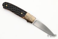 This knife by WD Pease features a hand rub satin finish blade with nail nick. The handle has mosaic Robert Eggerling Damascus bolsters and sidelock tab, Armadillo scales, stainless steel liners and fileworked spring and black fiber backspacer. Comes with leather Den's England Velcro case. Has gold plated screws. Nice lockup and blade seating. Excellent condition.