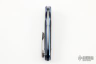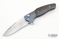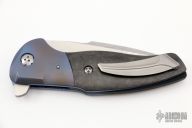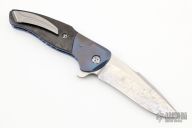 This Origin by Allen Elishewitz features a Damascus recurve blade with false top edge, flipper with logo medallion inlay. The handle has titanium dovetailed bolsters, carbon fiber scales with anodized titanium liners with jeweled interiors and textured edges. Tip up blasted titanium clip with hidden screws, black G-10 backspacer, bead blast finish titanium hardware and matching pivot. The button and the edges of the frame are textured. Nice detent, lockup and blade seating. Includes a nylon Velcro case.  Excellent Condition.