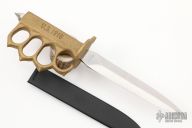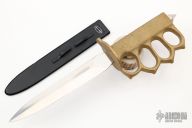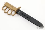 This is a Reproduction WWI L.F & C. trench knife made in Taiwan. Cast Brass handle with U.S. 1918 stamped. Has a polished blade with unsharpened edges. Comes with original box and sheath. Excellent condition.