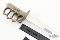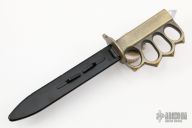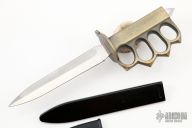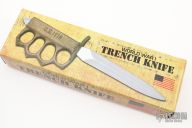 This is a Reproduction WWI L.F & C. trench knife made in China. Cast Brass handle with U.S. 1918 stamped. Has a polished blade with unsharpened edges. Comes with original box and sheath. Excellent condition.