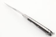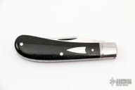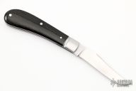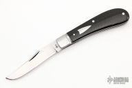 This Trapper by Charlie Bell features a satin finished blade with nail nick. The handle has satin finished fluted 416 stainless steel bolsters with integral liners, black burlap micarta covers with stainless steel escutcheon, CPM154 file worked spring. Has half-stop, flush in all positions. Comes with zippered case. Very well made slipjoint. Has some light scratches throughout. Excellent condition otherwise.