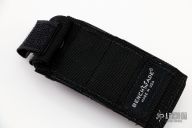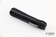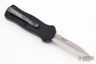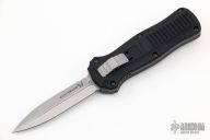 This 3350 Mini-Infidel by Benchmade features a bead blasted, double edge dagger style blade with fullers. The handle has a black anodized aluminum frame, ramped steel thumb slide and steel tip down clip. Includes original box, papers and nylon sheath. Has some scuffs and light wear on the handle finish, otherwise good condition.