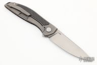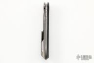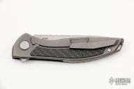 This HatiOn Zero by Shirogorov Knives features a tumble finished drop point blade with flipper. The handle is comprised of a milled Carbon Fiber "A" side and a tumbled titanium lockside with carbon fiber inlay, a titanium backspacer with recessed lanyard bail. 3D Machined titanium pocket clip is positioned for right hand, tip up carry. Comes with original box and papers. Rides on MRBS. Excellent condition.