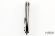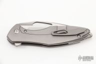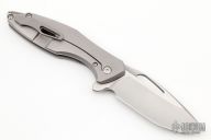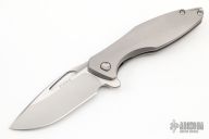 This Arius Flipper by Koenig knives features a burnished with PF blade with thumbhole and flipper. The handle has a bead blasted and pattern milled titanium frame satin titanium backspacer and a bead blasted tip up clip with hidden screws. Has ceramic bearings and a ceramic detent ball. Nice detent, lockup and blade seating. Comes with original box and COA dated September 26, 2022. Excellent condition.