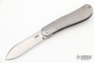 This Dogleg Front Flipper by Enrique Pena features a satin finished blade with a front flipper and notched thumbrest. The handle has a titanium frame with a titanium backspacer and matching tip up pocket clip. Includes a Pena X-Series padded box. Excellent condition.