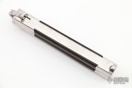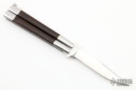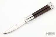 This early balisong from Pacific Cutlery features a Jody Samson ground satin finished blade with long clip bowie shaped blade and an Imada high hollow grind. The handles are stainless steel with black canvas micarta inlays, has t-latch. Has light scratches, otherwise excellent condition for its age. This balisong was produced in the mid-late 80s. Comes with an email from Vance Collver, a 30+ year Benchmade employee, stating its authenticity and rarity of the combination of grinds. To put it in his words, "Pretty cool piece of Benchmade history you have there!"