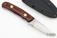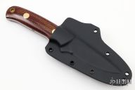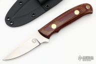 This K-33 Bird and Trout by Dozier Knives features a satin finished blade with .113" blade stock and .837" blade depth, full tang construction. The handle has red canvas and brown burlap layered micarta scales with brass pins and lanyard hole. Comes with kydex sheath. New from maker.