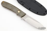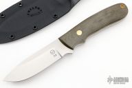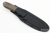 This K-54 Razorback Hunter by Dozier Knives features a satin finished blade with .138" blade thickness and 1.131" blade depth, full tang construction. The handle has green canvas micarta scales with brass pins. Right handed kydex sheath. Brand new from maker.