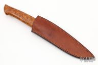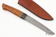This knife by Jean-Paul Sire features a Damascus drop point blade with a hidden tang construction, .197" blade stock and 1.092" blade depth.  The handle has a burl wood guard and burl wood grip with black/white spacers.  Includes a brown leather sheath. Excellent Condition.