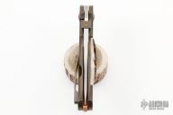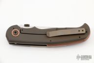 This Shakar Framelock by David Sharp features a hand rub satin finished blade with an anodized titanium thumbdisc. The handle has a bead blasted and anodized titanium frame, popcorn stag inlay, tip up anodized titanium clip and a copper backspacer and pivot collars. Nice detent, lockup and blade seating. Nice detent, lockup and blade seating. Excellent condition. Comes with a zippered case.