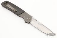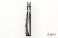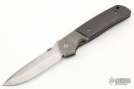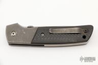 This ATCF from Bob Terzuola features a tumbled drop point blade with swedge, thumbdisc and notched thumbramp. The handle is comprised of anodized titanium bolsters and liners, carbon fiber scales and an anodized and eggshell finished titanium backspacer, tip up titanium clip. Lanyard hole in pommel. Has scratches and scuffs, otherwise good user condition.