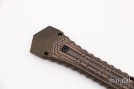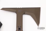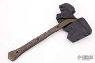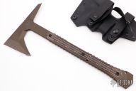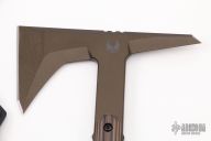 The Ragnarok 14" is a full tang tomahawk made from .270" 80CRV2 carbon steel and features grippy 3D contoured Hyena Brown G10 handle scales. The handle end features a one of a kind pry-bar feature, and the holes provided in the handle allow for the addition of paracord to help lock it in to your hand for aggressive use. The Ragnarok is your high-end skeleton key that gives you access by prying, chopping, cutting and smashing!