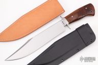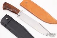 This bowie by Matt Lamey features a satin finished clip point blade with sharpened top edge, .295" blade stock and 2.139" blade depth, hidden/mortise tang construction. The handle has a stainless steel guard and a walnut grip with stainless steel pins. Comes with a brown leather sheath and a kydex sheath. Has a couple very light scratches, otherwise excellent condition.