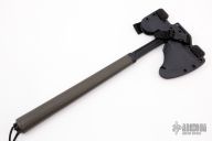 This Shrike by RMJ is a TAD Gear edition from August 2013. Has a black coated blade with hammer pole, .359" blade stock, hidden tang construction. Handle is molded rubber with 4140 end cap/ glass breaker that houses a sharpening stone. Comes with original kydex sheath. Has a few light scuffs, otherwise excellent condition.