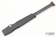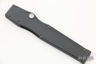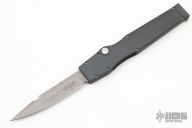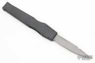 This Combat/Front Opener by Microtech Knives features a bead blasted clip point blade. Single action, side positioned button for firing. Closure via a reverse charging handle in the rear of the frame. The handle has a contoured aluminum frame with rubber grips on the top and bottom of the frame. Dated 04/95.  Includes a padded zippered case.  Scuffs are visible on the blade and handle otherwise the knife is in excellent condition.