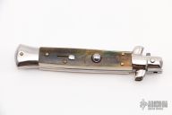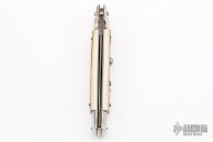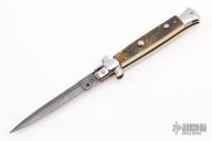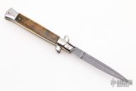 This Swivel Bolster from AB Italy features a Damascus dagger ground blade. The handle is comprised of nickel silver bolsters, mammoth ivory scales over brass liners and stainless steel backspacer. Excellent condition.