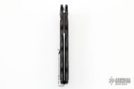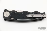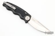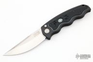 This SOG-TAC Auto has a satin finish upswept blade with notched thumb rest. Handle is black anodized aluminum with safety, lanyard hole, and stainless steel tip up clip - RH/ LH reversible. Excellent condition.